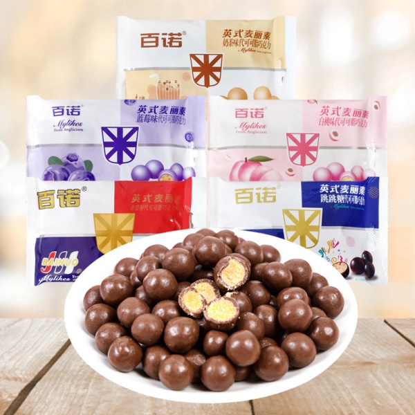 百诺英式麦丽素65克白桃蓝莓奶茶跳跳糖涂层型代可可脂牛奶巧克力