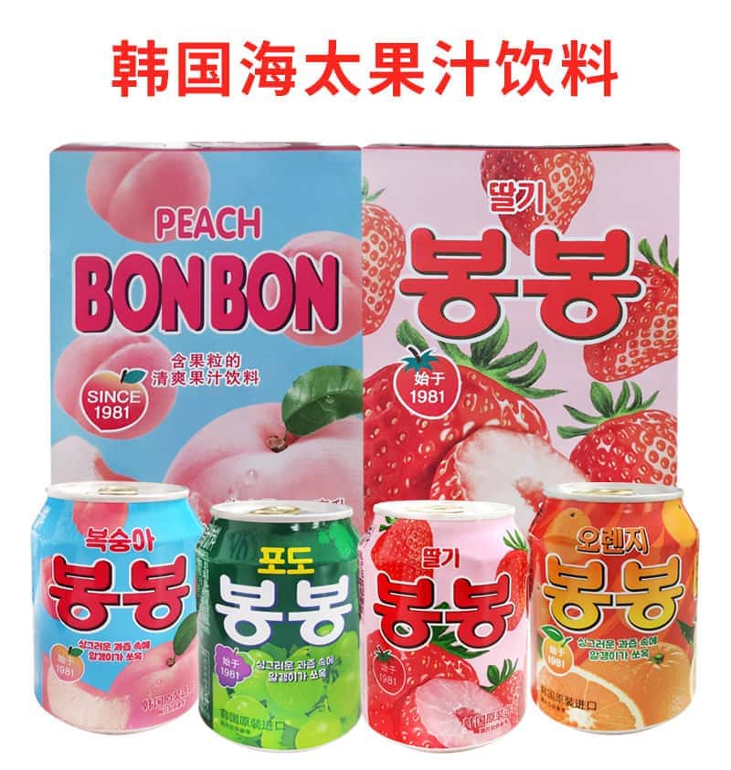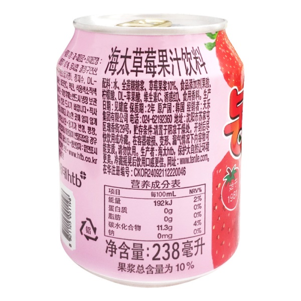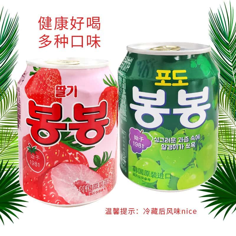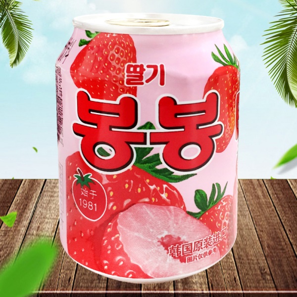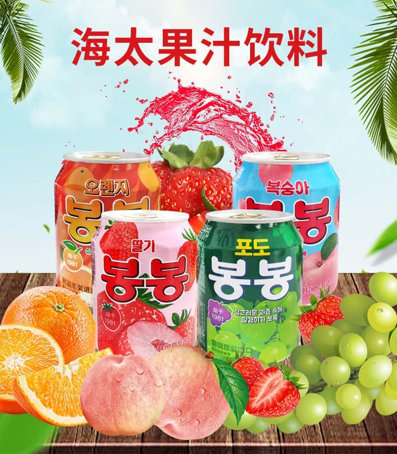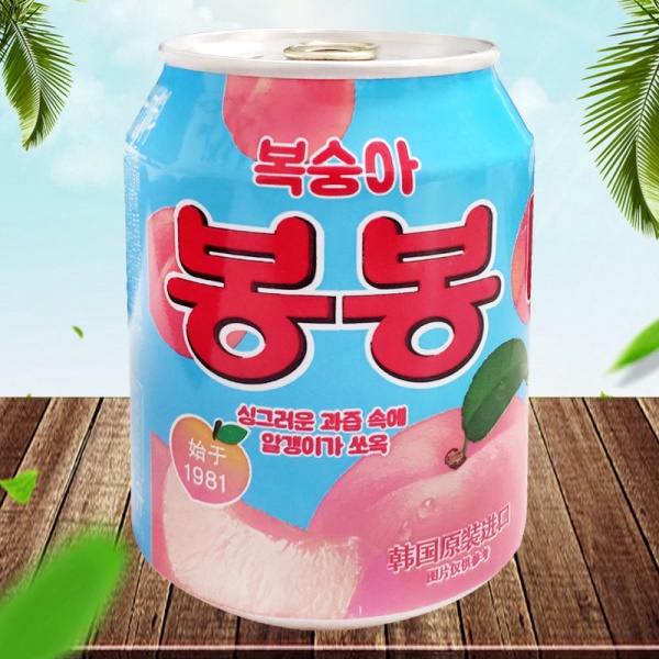 韩国进口网红饮料海太桃汁草莓葡萄果粒果汁果肉238ml/罐休闲饮品
