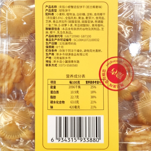 夹馅小螃蟹软盒班兰椰麦味140g/盒
